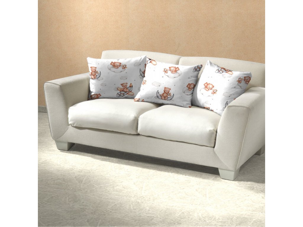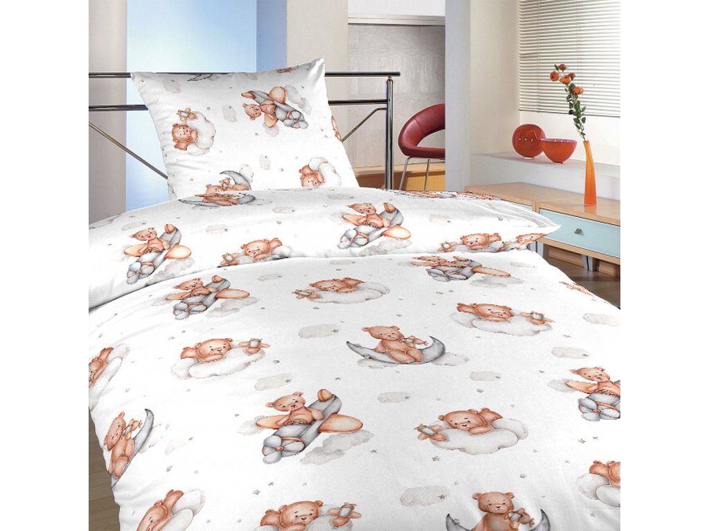 Bílé povlečení je zdobeno jemnými ilustracemi medvídků, kteří odpočívají na měsíci, leží na obláčcích nebo si hrají s hvězdičkami. Design působí něžně a hravě, ideální pro klidný spánek těch nejmenších.