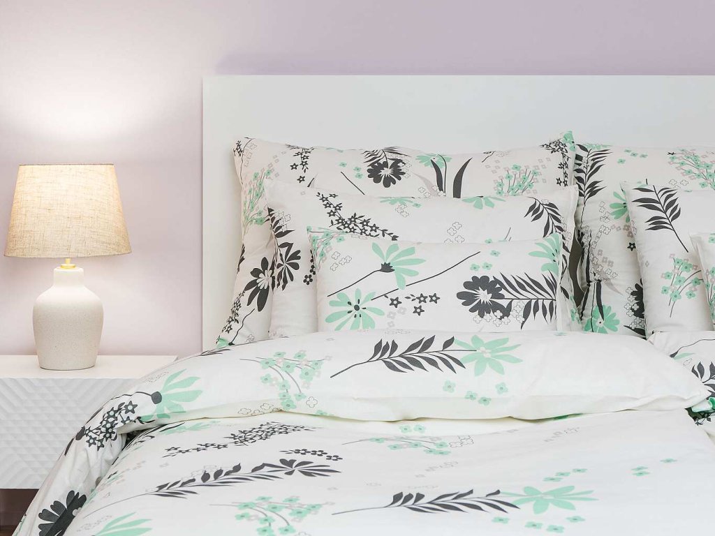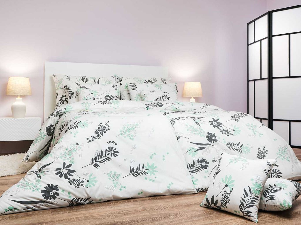 Komfortní ložní prádlo s jemným květinovým vzorem v mentolové a černé barvě na bílém podkladu přinese do vaší ložnice svěží eleganci a přírodní harmonii. Vzor Agáta mentolová je exkluzivním designem z dílny českého výrobce DADKA VRACOV. Ideálně ladí s prostěradly v barvě bílá, světle šedá, tmavě šedá, stříbrná nebo mentolová.
