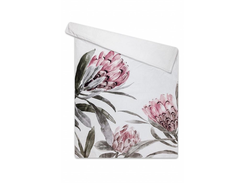 Luxusní povlečení Mikroflanel Botanika značky SLEEP WELL® přináší do ložnice svěžest přírody a maximální pohodlí. Bílý podklad s velkými květy protey v růžových a bílých tónech doplněný zelenými listy vytváří elegantní botanický vzhled.