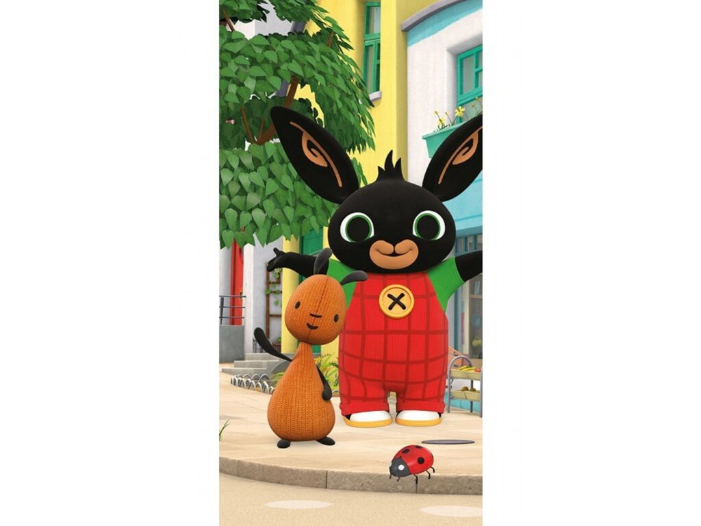 Roztomilá dětská osuška s motivem Zajíčka Binga, Flopa a berušky. Rozměr 70×140 cm, jemné a savé bavlněné froté. Skvělý společník pro každodenní koupání i letní výlety.