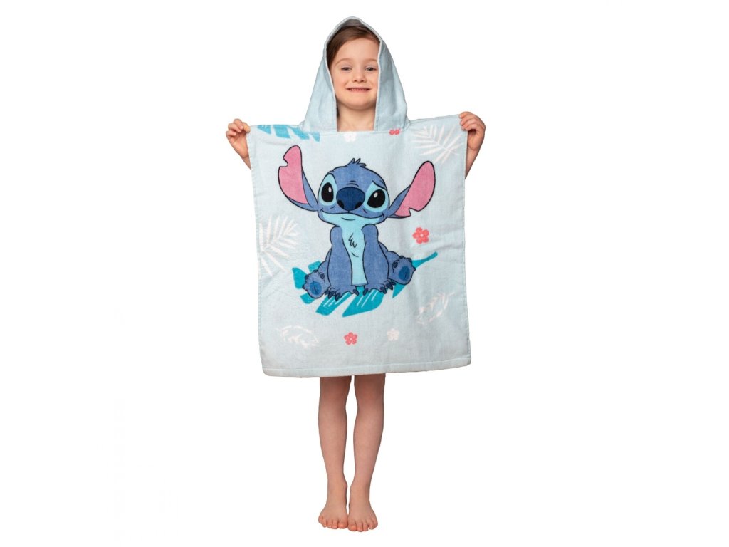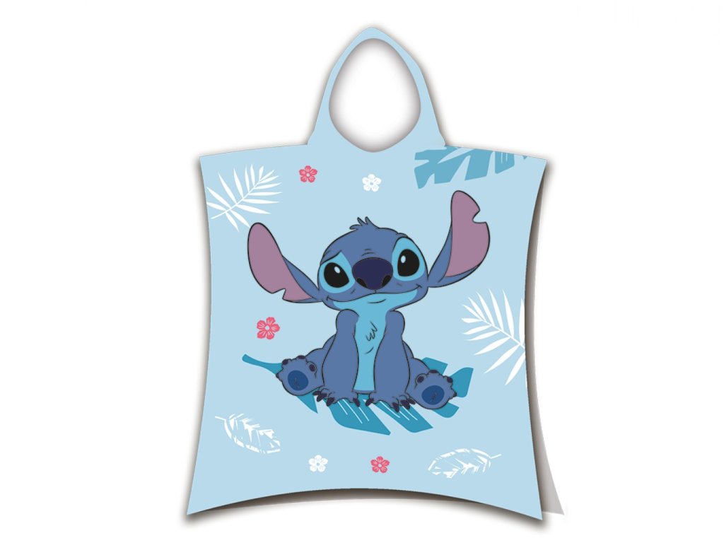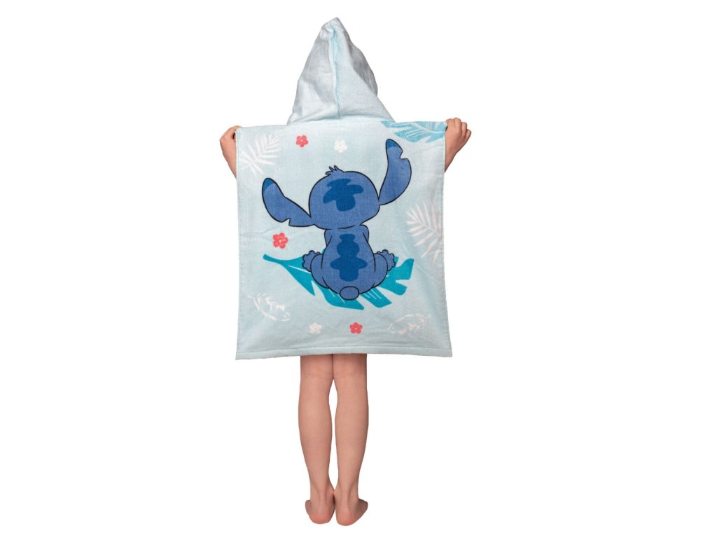 Stylové pončo s motivem Lilo and Stitch přináší radost a pohodlí po každém koupání. Přední stranu zdobí sedící Stitch s veselým výrazem, zadní stranu sedící Stitch zezadu – vše na modrém podkladu s dekorativními prvky jako listy a květiny. Pončo je ideální jako osuška i župánek a díky kapuci krásně zahřeje.