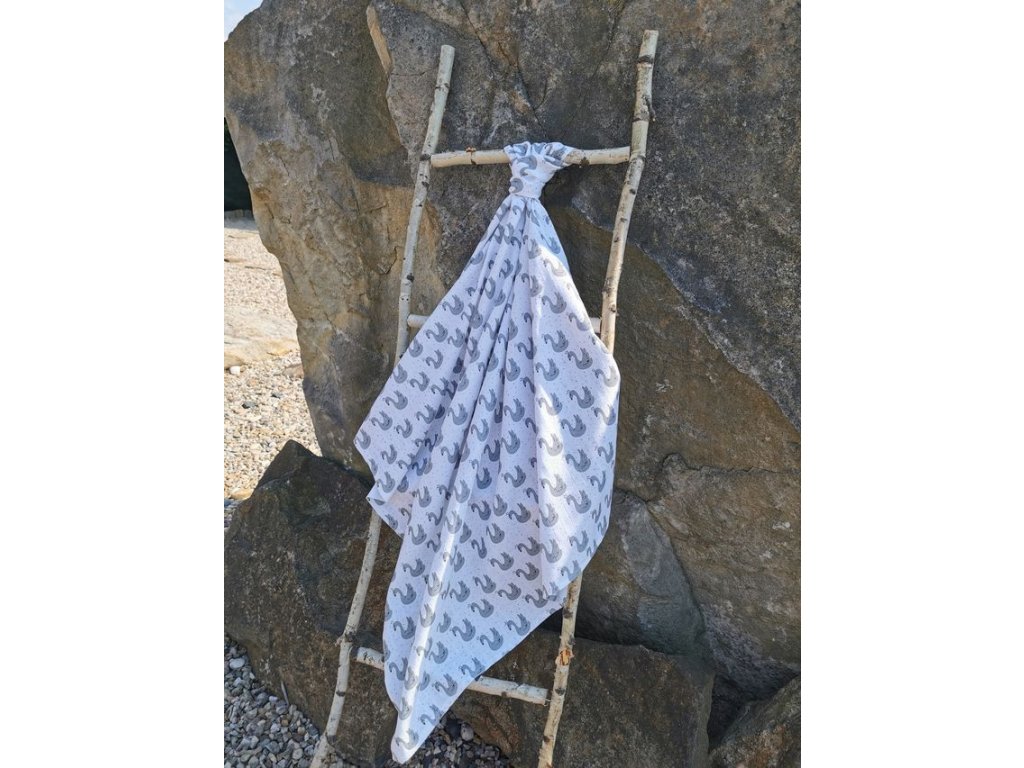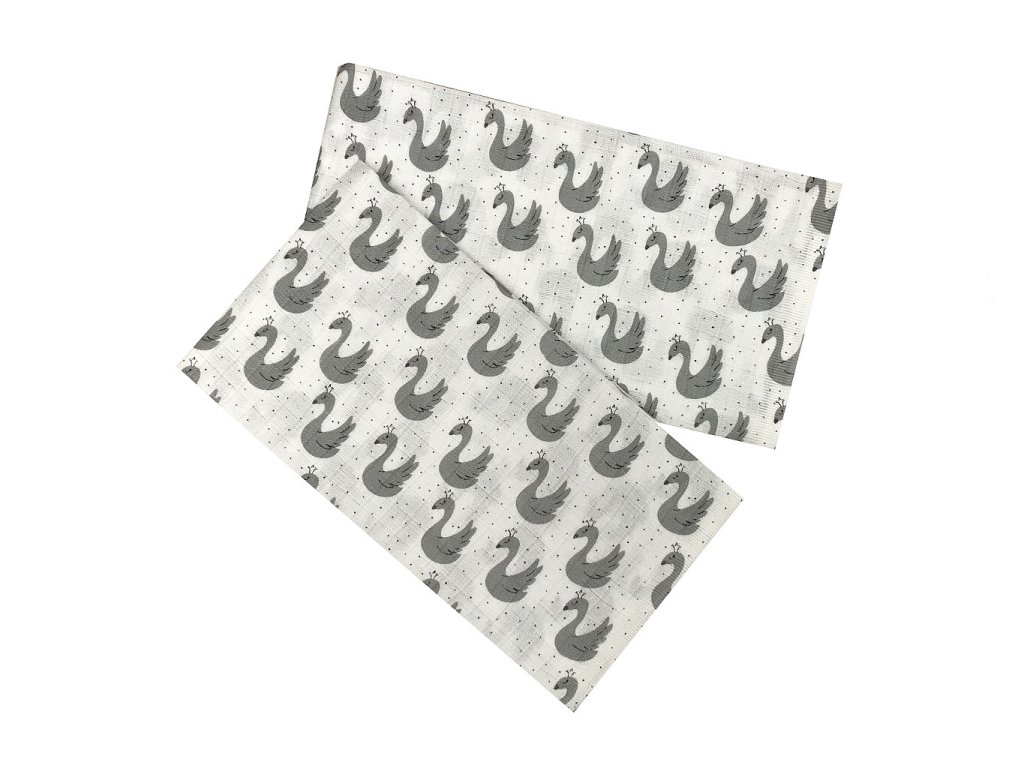 Dětská bambusová plena s potiskem šedých labutí. Rozměr 70x70 cm. Baleno po 5 kusech. Materiálové složení: 60% bavlna + 40% bambus. Plošná hmotnost: 118 g/m2. Barva: tisk