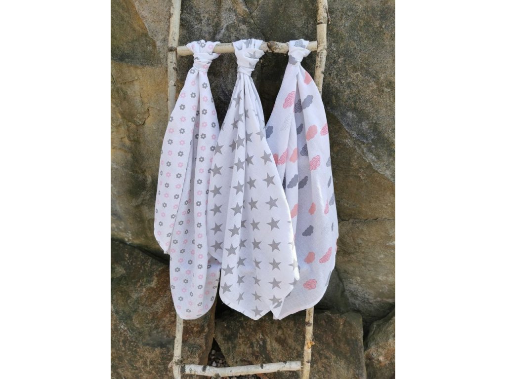 Dětská plena s potiskem šedých hvězdiček Baleno po 5 kusech. Rozměr : 70 x 70 cm. Materiálové složení : 100% Bavlna. Plošná hmotnost : 118 g/m2.