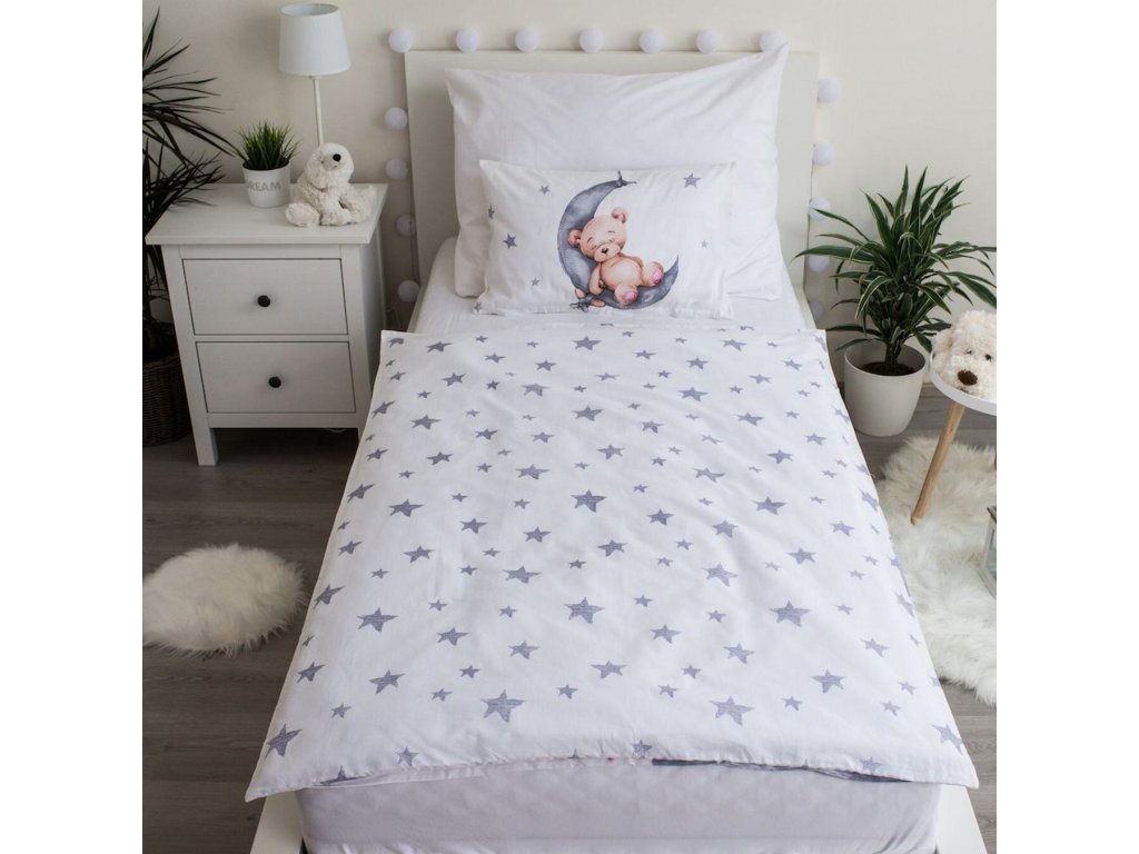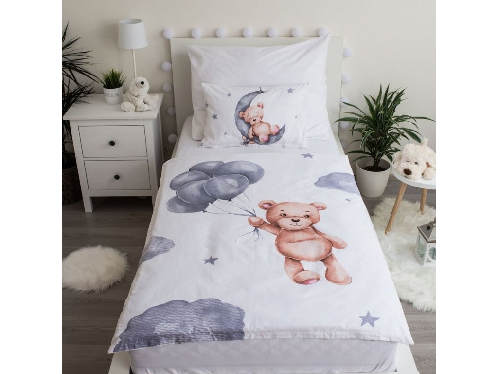 Roztomilé povlečení do dětské postýlky s jemným motivem medvídka na měsíci a medvídka s balónky. Pozadí tvoří bílá barva s šedými hvězdičkami a obláčky. Ideální pro malé snílky a milovníky zvířátek.