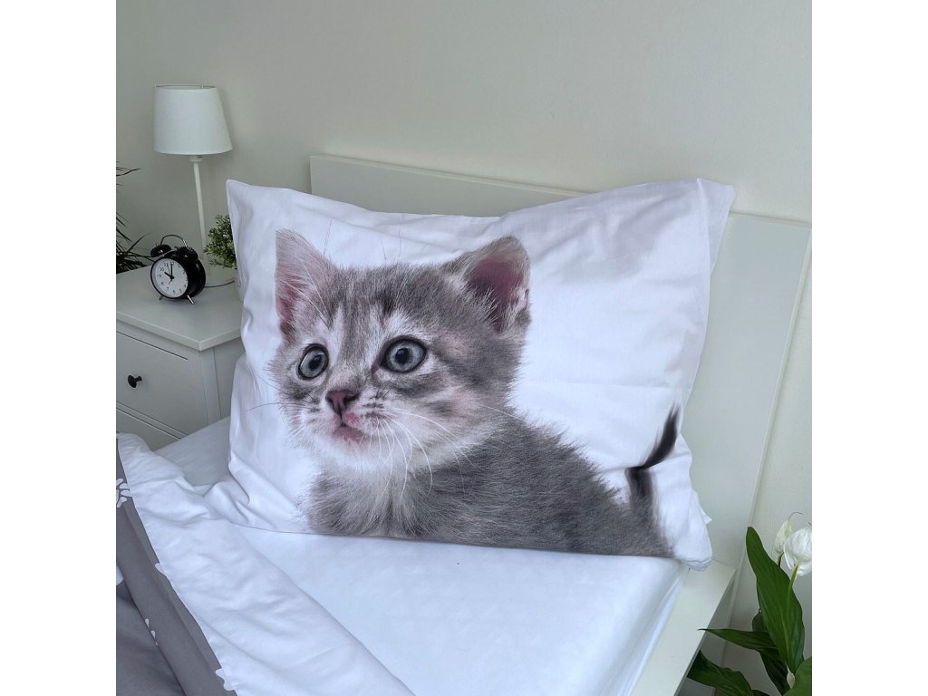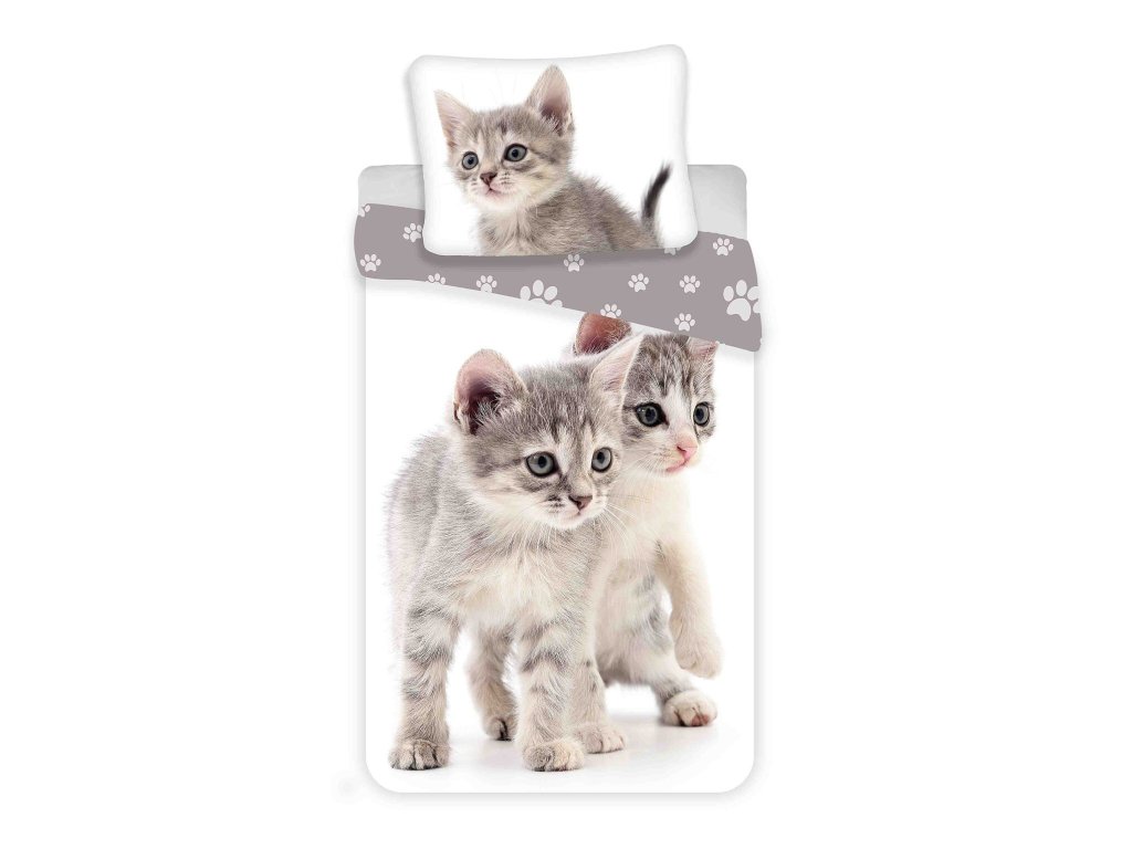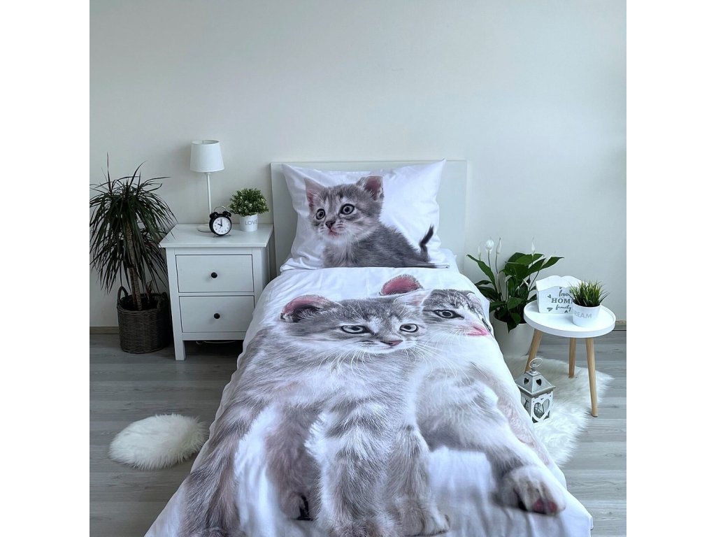 Zútulněte svůj pokoj roztomilým povlečením, které potěší každého milovníka koček. Povlak na polštář i přikrývku zdobí realistický potisk dvou šedých koťátek s výraznýma očima, které dodají prostoru hravý a přívětivý nádech. Šedé pozadí s bílými otisky tlapek navíc povlečení propůjčuje moderní a stylový vzhled.