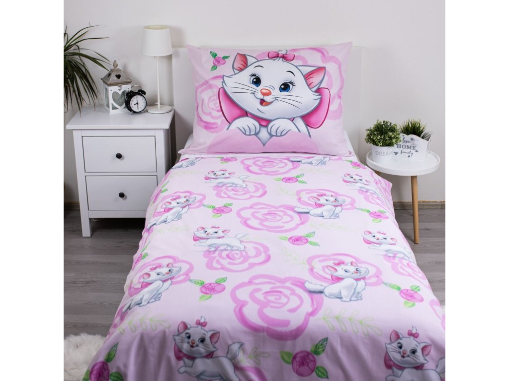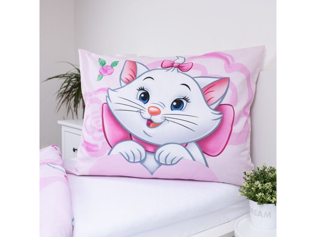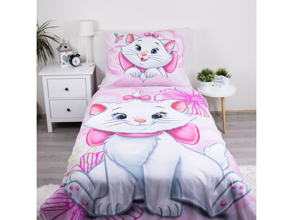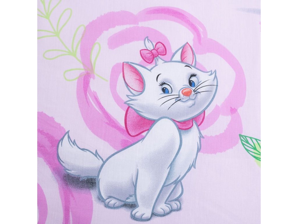 Vstupte do kouzelného světa s povlečením Marie Cat Pink 03! Tento nádherný design přináší animovanou postavu Marie, bílou kočičku s modrýma očima a růžovou mašlí na hlavě a kolem krku, na růžovém pozadí s květinovým vzorem. Na přikrývce je ilustrace Marie, která dodává povlečení roztomilý vzhled.