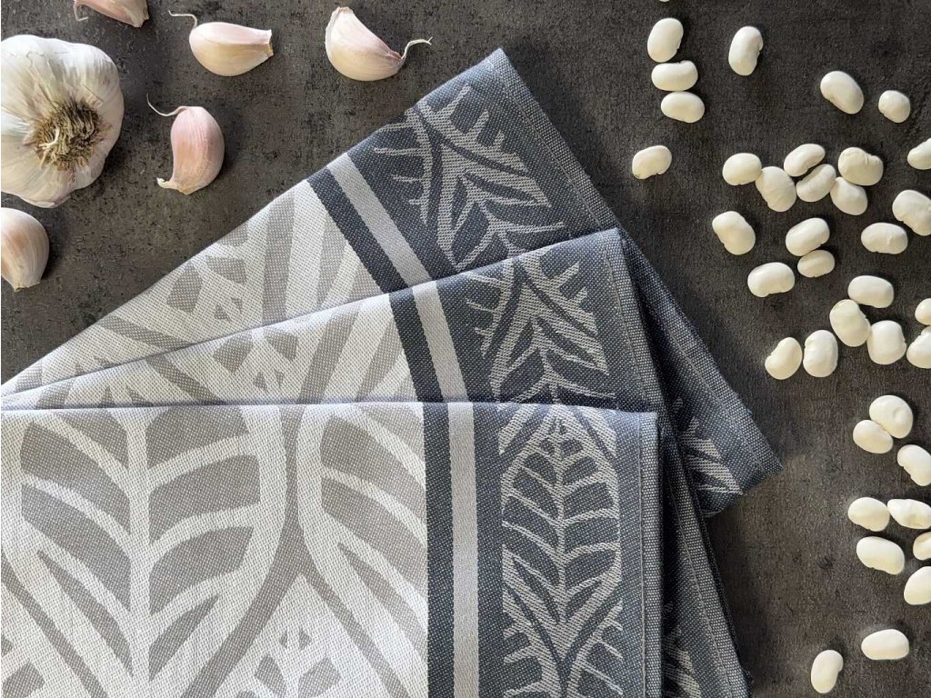 Sada tří bavlněných žakárový utěrek - extra savé. Vzor listy šedé.