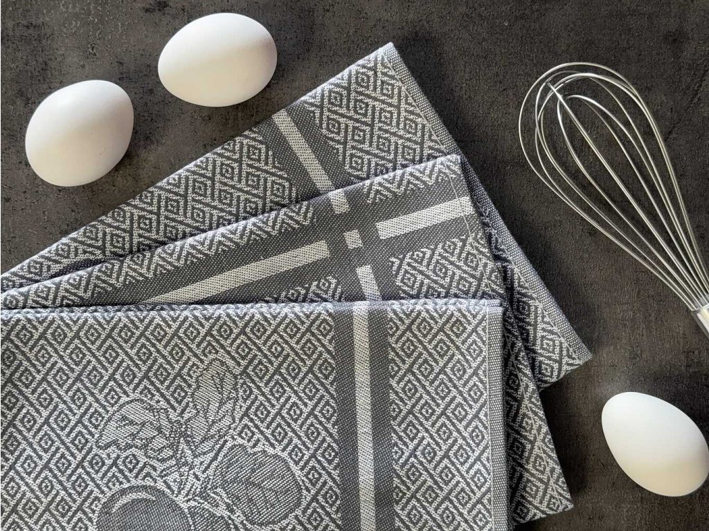 Sada tří bavlněných žakárový utěrek - extra savé se vzorem ředkvičky laděné do šedé barvy. Rozměr utěrek je 3x 50x70 cm.
