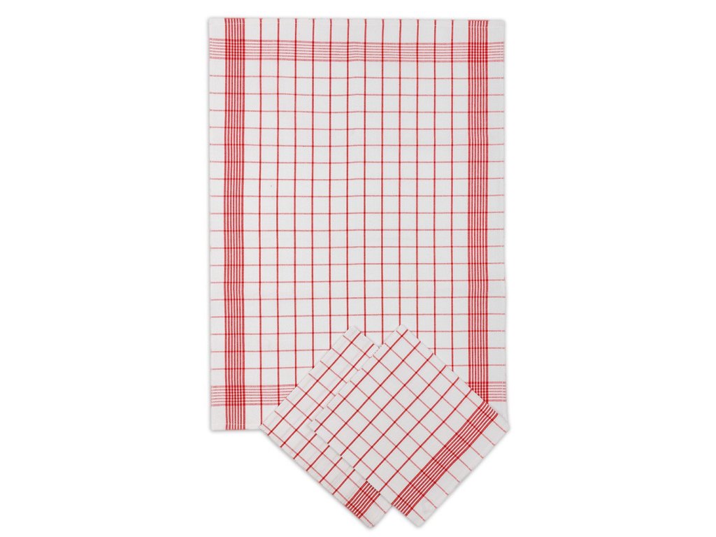 Sada tří bavlněných utěrek s kostkami - kombinace barev bílá a vínová.